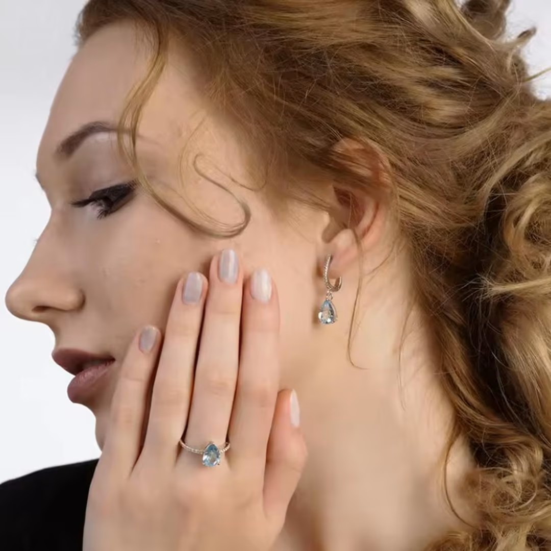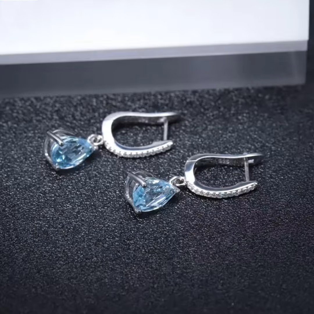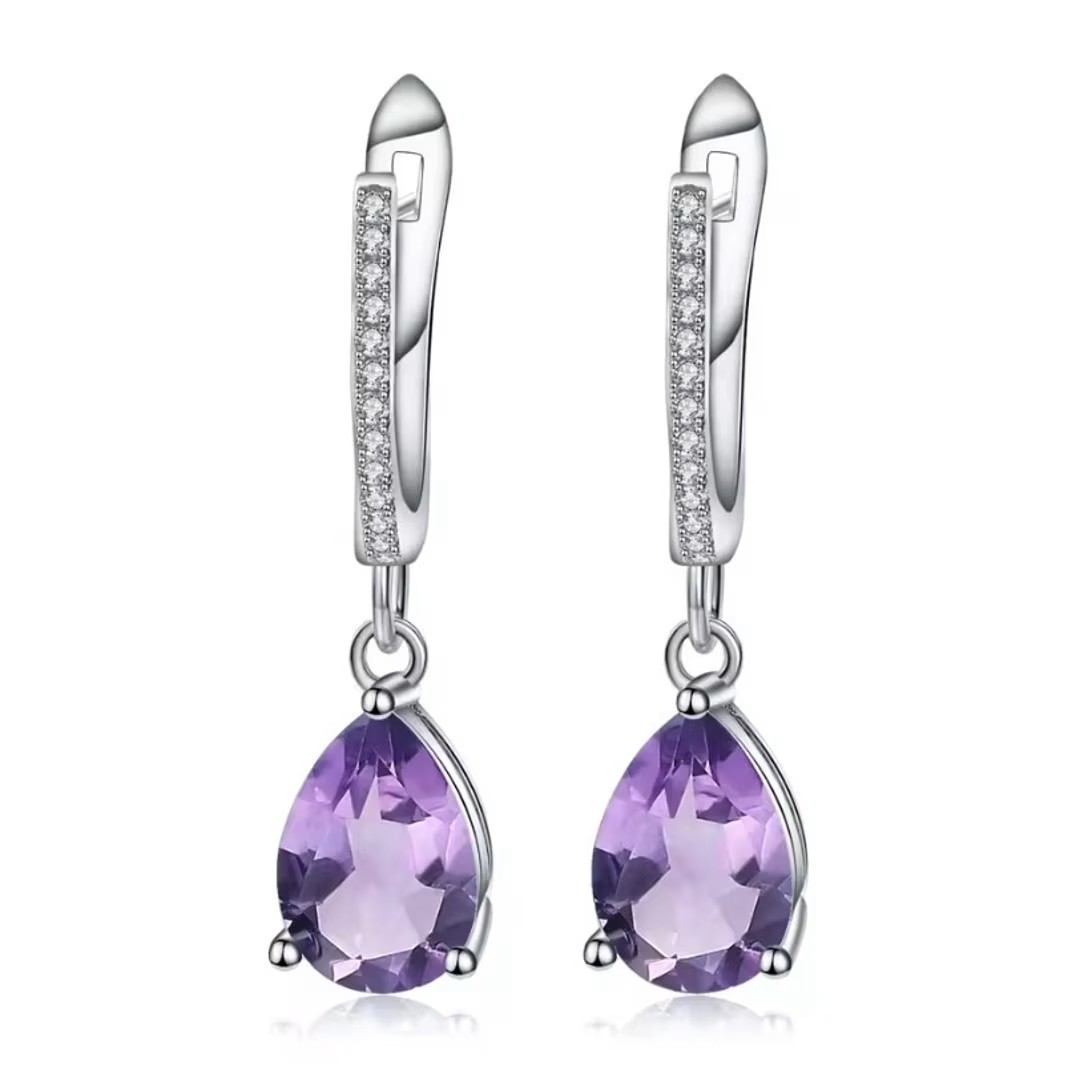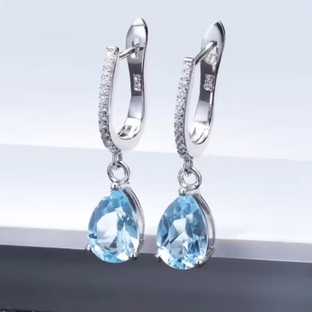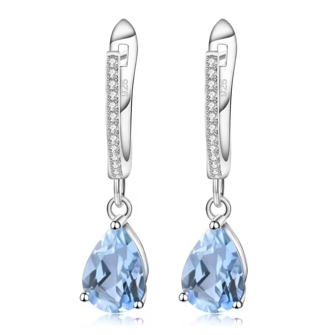 - الوصف: أقراط فاخرة للمناسبات من حجر الجمشت/ حجر التوباز على شكل قطرة، فضة إسترليني