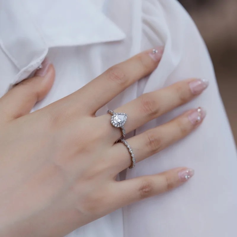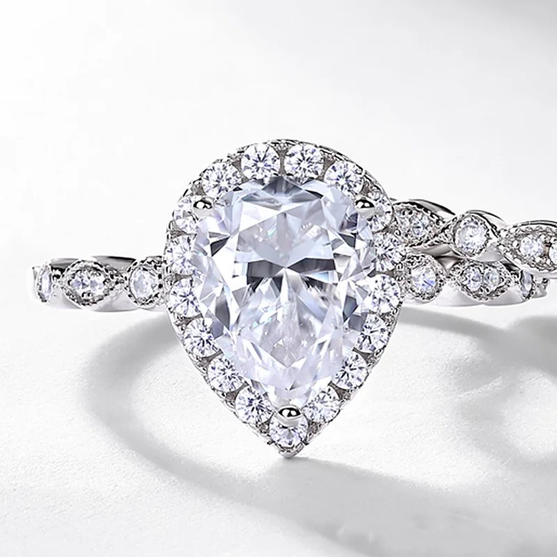 - الوصف:خاتم فاخر وراقي للمناسبات والزفاف مويسانيتي ذو جودة عالية على شكل كمثرى يتكون من قطعتين، فضة إسترليني