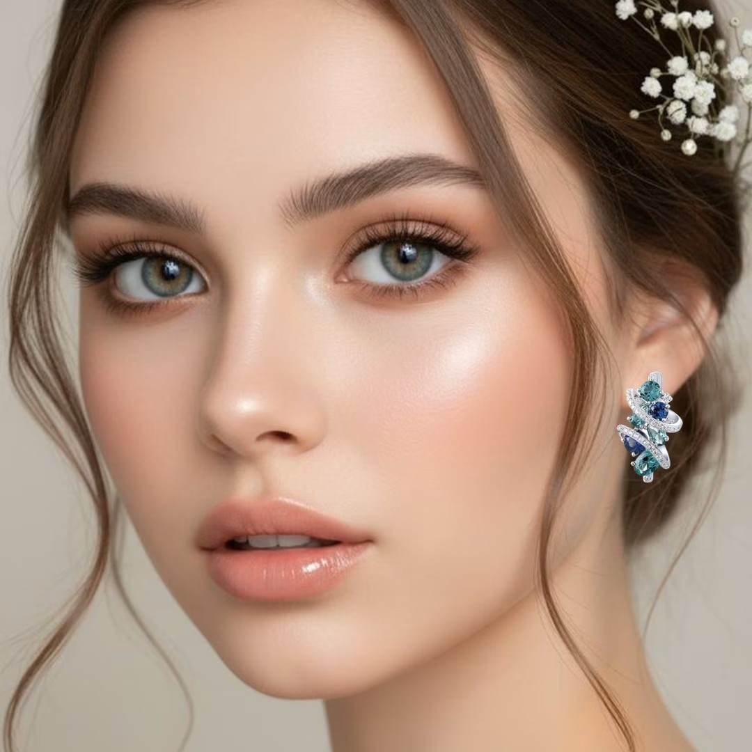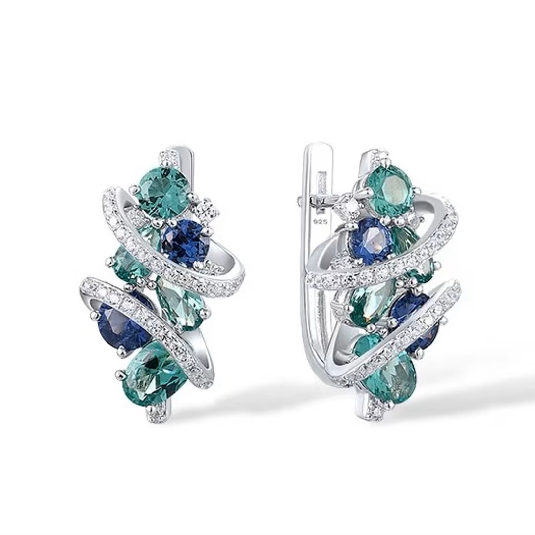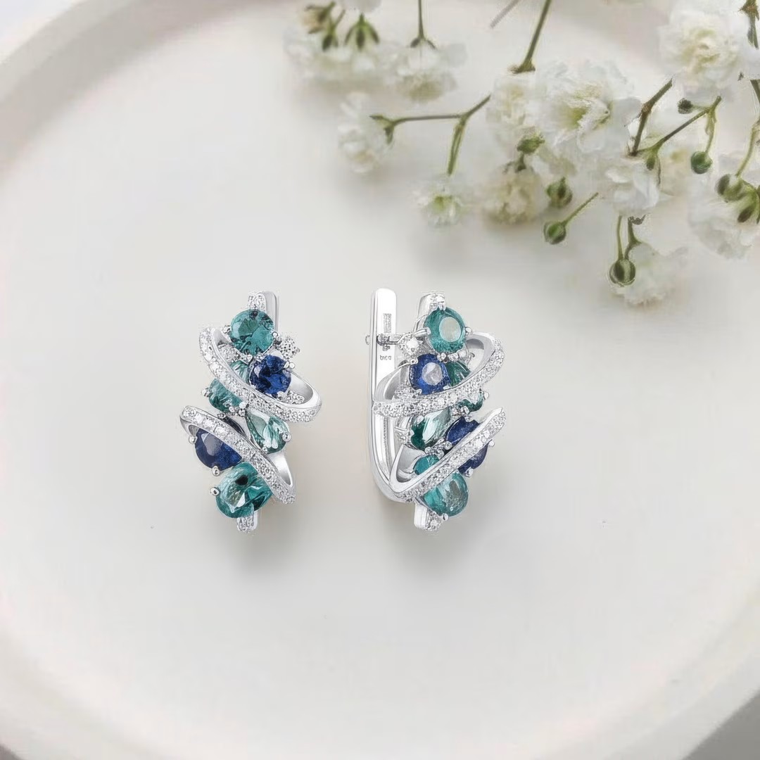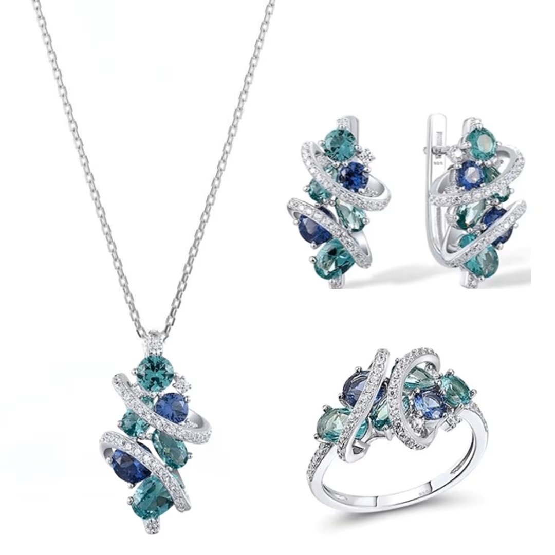 الوصف: طقم مجوهرات عصري وفاخرللمناسبات، أحجار كريمة جودة عالية، أقراط وخاتم وقلادة، فضة إسترليني