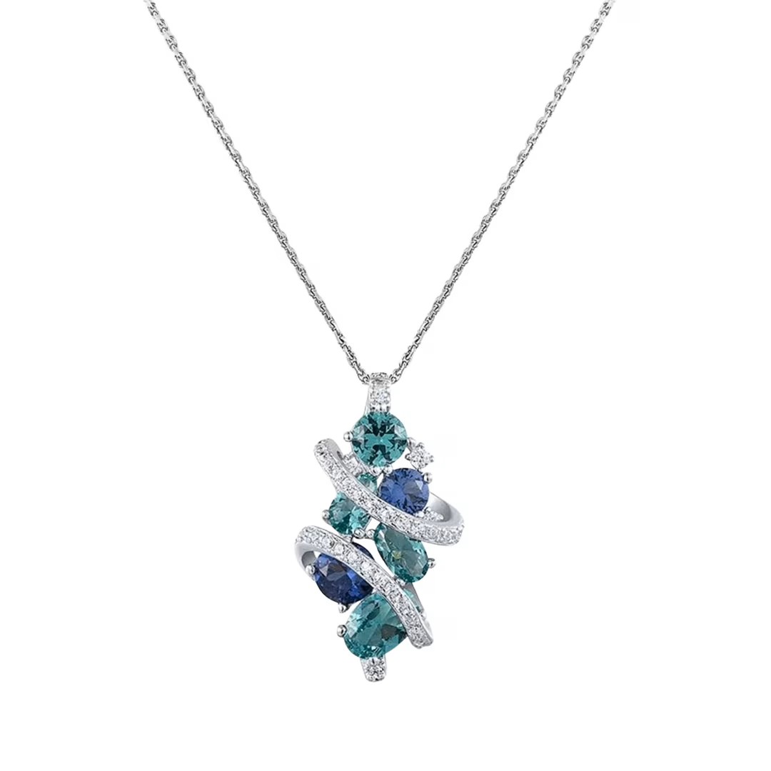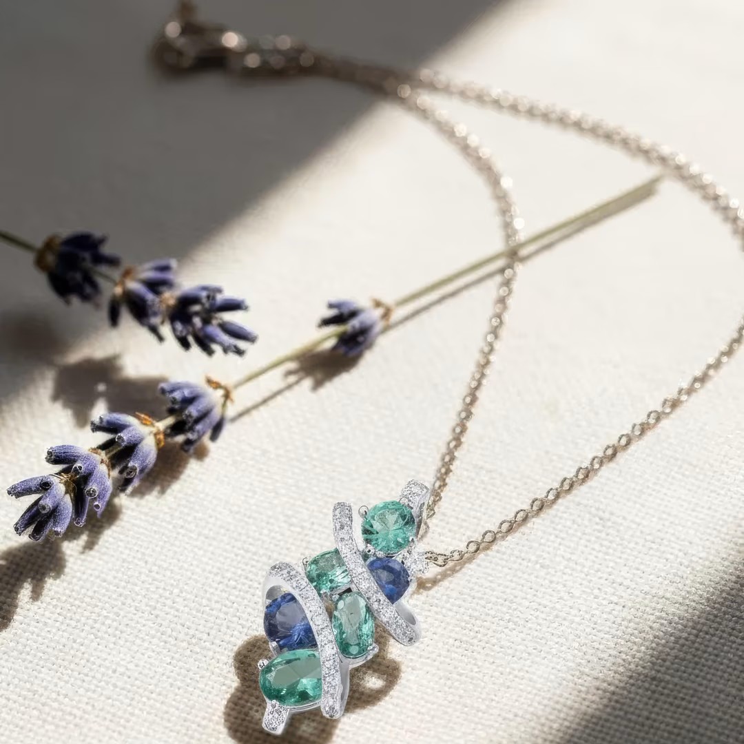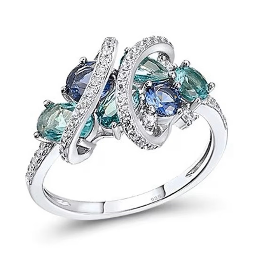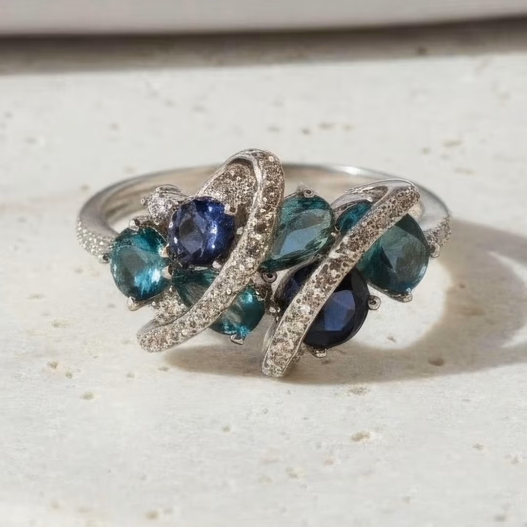 الوصف: طقم مجوهرات عصري وفاخرللمناسبات، أحجار كريمة جودة عالية، أقراط وخاتم وقلادة، فضة إسترليني