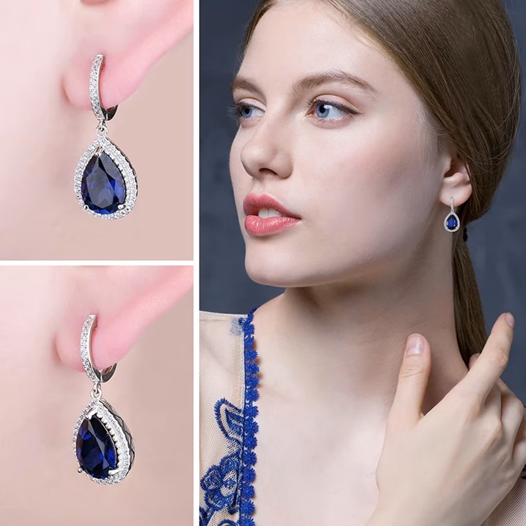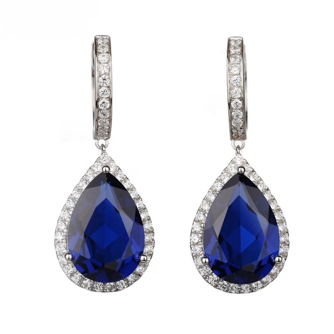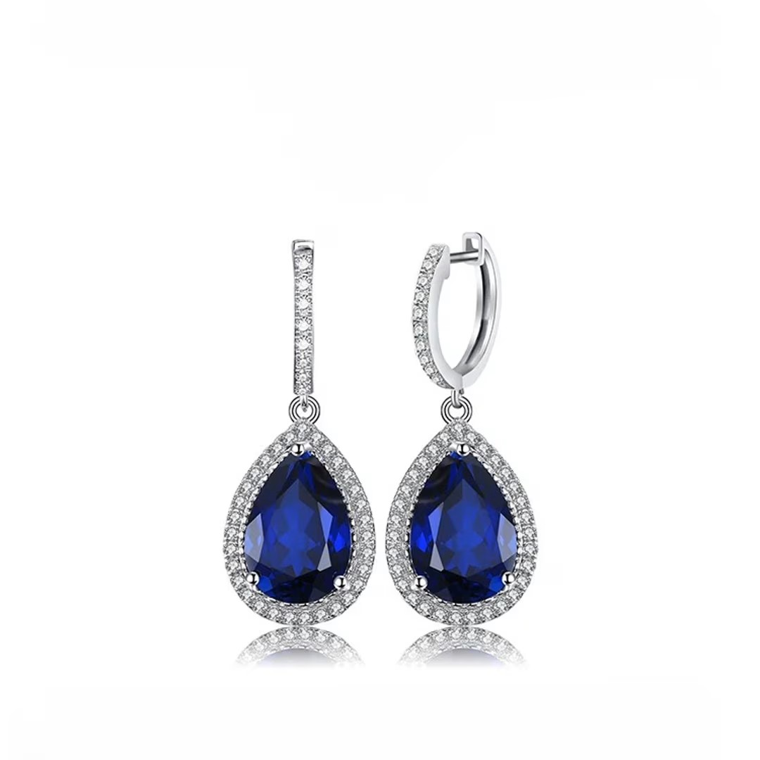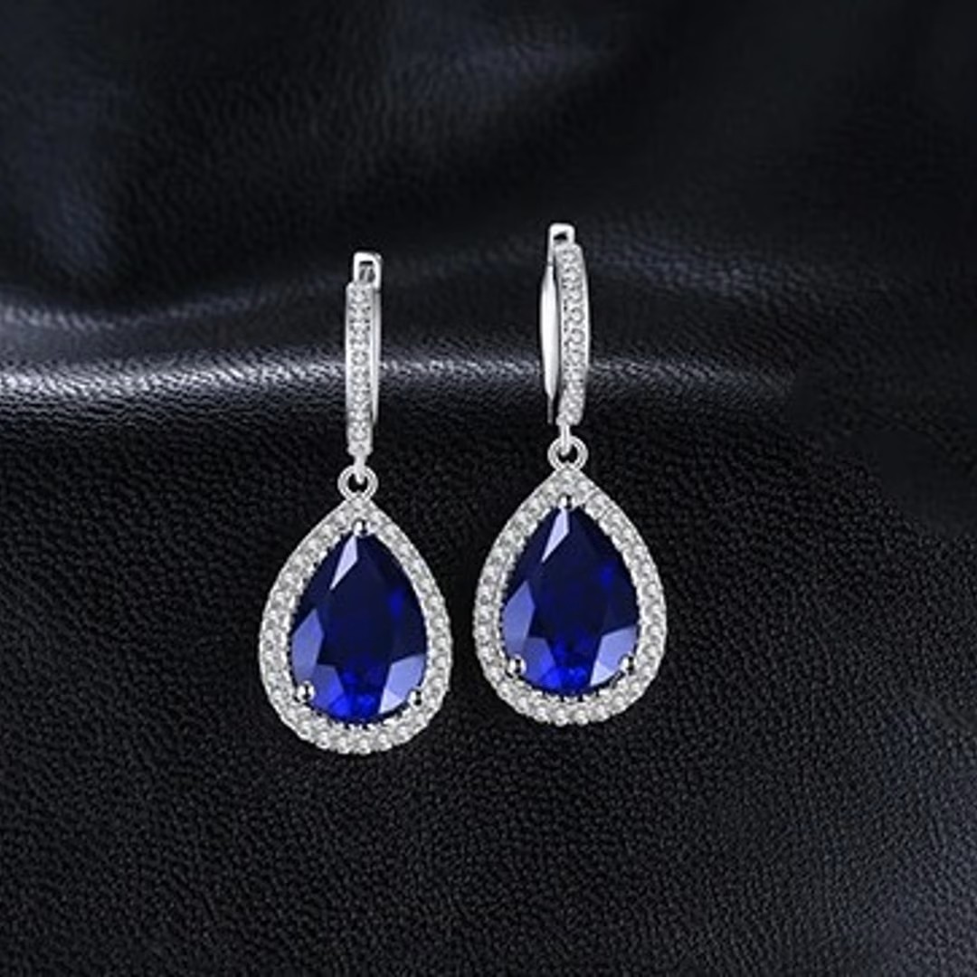 الوصف: أقراط فاخرة للمناسبات والأعراس من الياقوت الأزرق على شكل كمثرى ، فضة إسترليني